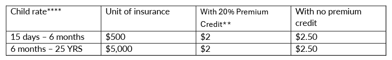 Child(ren): $5,000, for Children older than 6 months; $500 for children 15 days and older. (No coverage for children under 15 days)