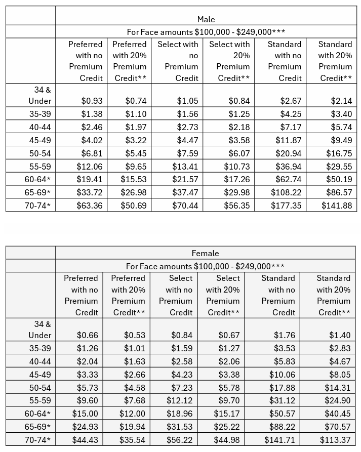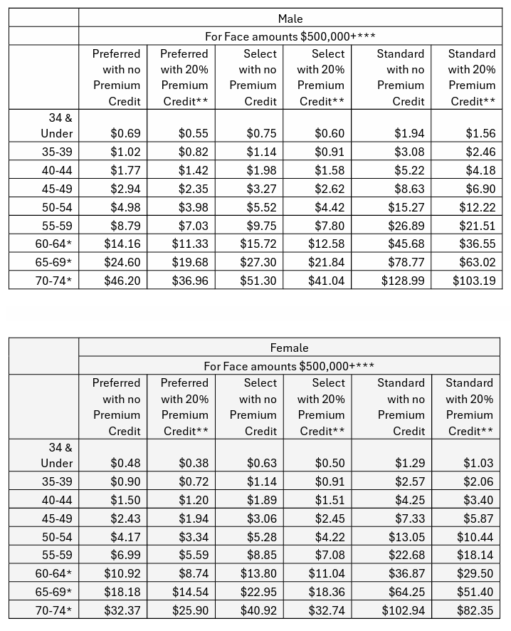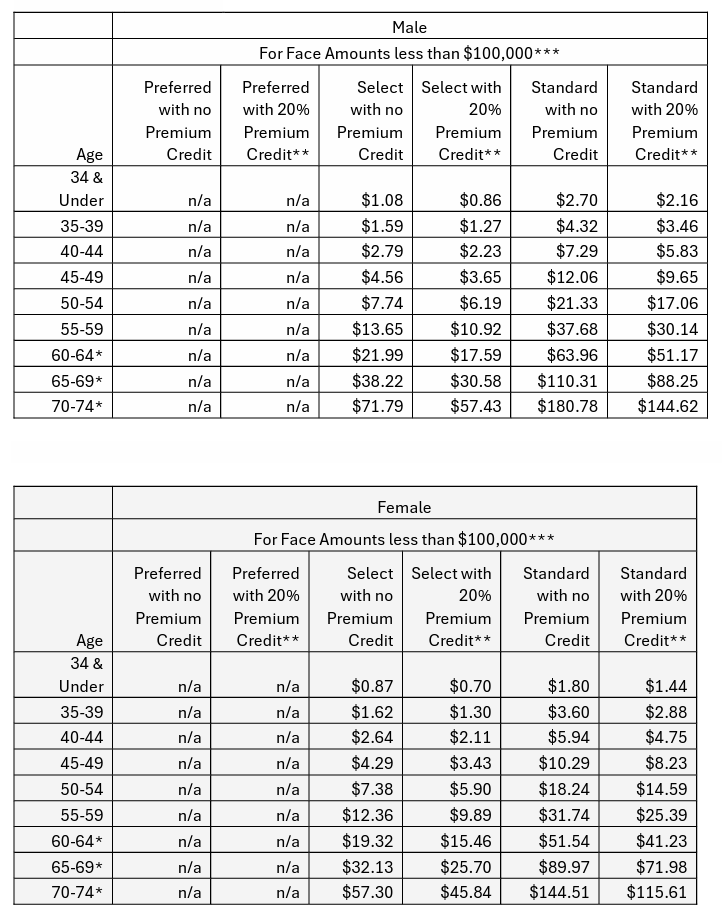 ***Benefit per $10,000 of coverage. Benefit amounts available: $10,000-$1,000,000.