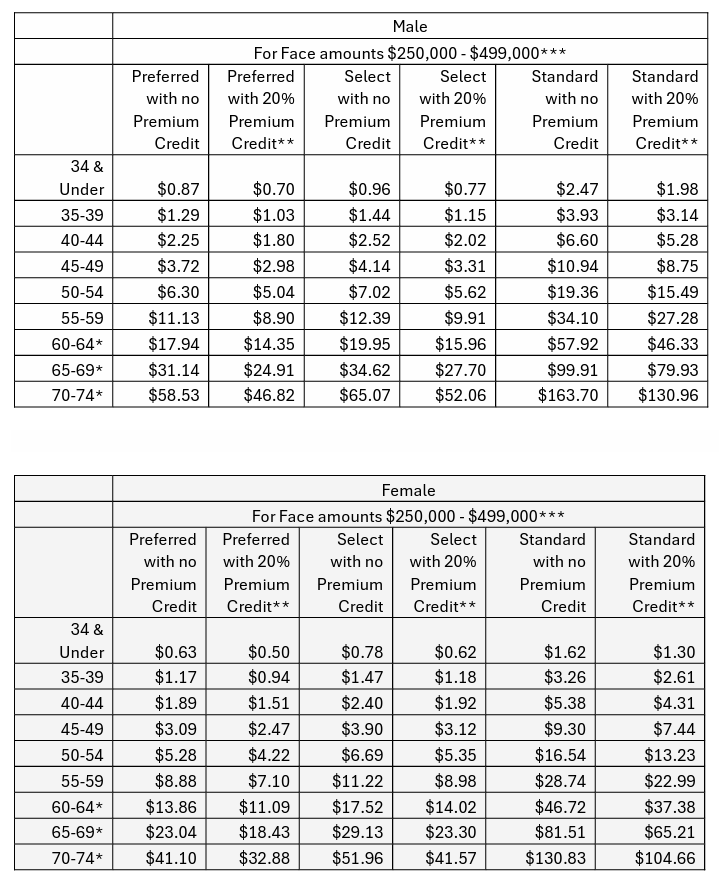 If you or your spouse becomes insured for coverage amounts of $250,000 through $499,999, you’ll receive a volume discount. For amounts $500,000 through $1,000,000 of coverage, you’ll receive an even bigger discount.